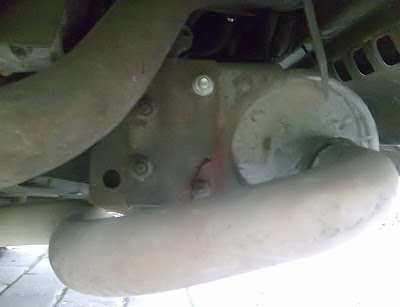 Udstødningen (potte + afgangsrør) skal skiftes og jeg regner med at smide en THansen fætter på. Problemet er bare at selve beslaget (venstre side) også er knækket. Gider ikke svejse på det gamle skrammel og er egentlig heller ikke med på at give VW 350 kroner for det stykke blik.