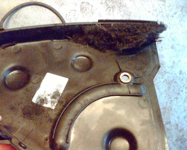 Nå, jeg kom forsent til liften, men graven var ledig så jeg fik skubbet bilen der ind over i stedet. Størstedelen af tandremmen var spredt ud over motorrummet. 3 sec med en luftpistol og der var rent igen. Dog havde jeg ikke lige tænkt på at tage et billed til læserne, men heldigvis var der "bid" igen da jeg fik kigget nærmere på tandremsdækslet.